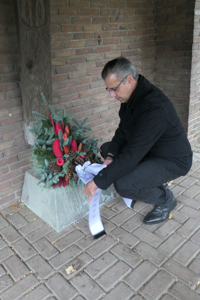 Katharina Reinhold und Stefan Crefeld legen am Kriegerehrenmal an der Rheinfährstraße ein Gesteck nieder.